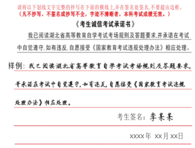 7。落实笔迹消息采集要求。考生应正在答题卡指定区域完整抄写《考生诚信测验许诺书》,凡不抄写、不签名、不填写日期或抄写不全,该科测验成就无效。考生结业时,省教育将对每张答题卡上的《考生诚信测验许诺书》笔迹进行复核,凡笔迹不分歧、经判定为的,将按照《国度教育测验违规处置法子》做出成就做废、延迟结业、记入国度教育测验诚信档案等处置。《考生诚信测验许诺书》抄写样例如下图。
