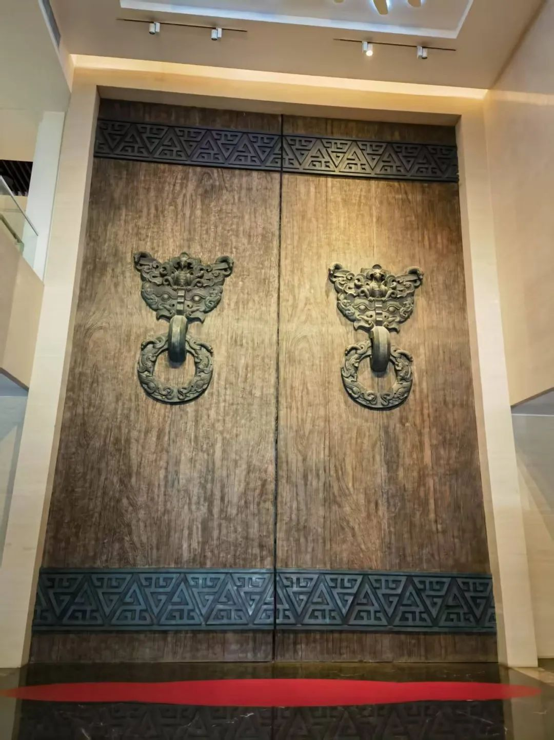 春夏之交,记者来到了市易县。走进易县博物馆大厅,整面墙壁上鲜明呈现两扇仿古门,最惹人瞩目的是门上两个巨大的透雕龙凤纹铜铺首,兽首上部正中坐立凤鸟,两侧盘绕长龙,华美灵动中透着严肃。